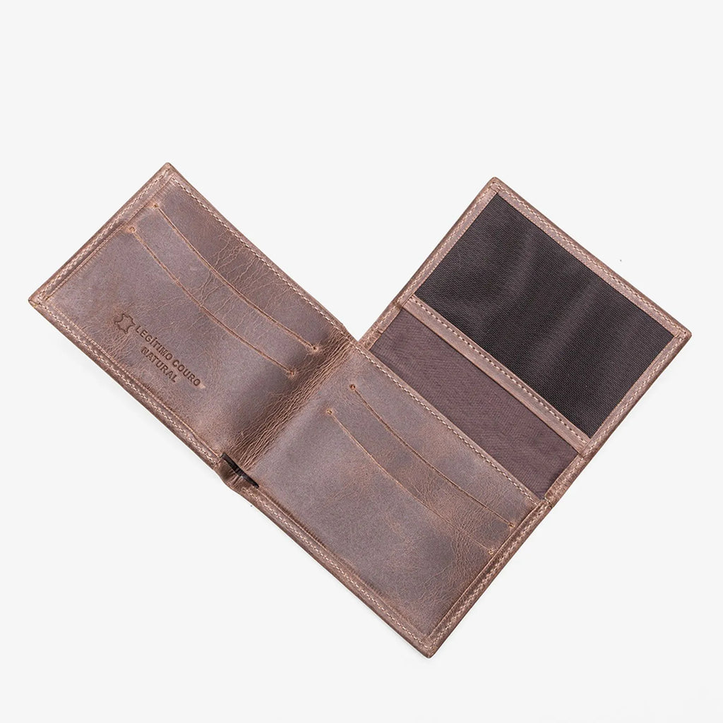 Carteira confeccionada em couro, na cor caramelo. Parte interna com 4 divisórias para cartões, 1 divisória para moedas,1 compartimento interno extra, e 1 abertura total para cédulas.Dimensões: 10,5cm x 8cm